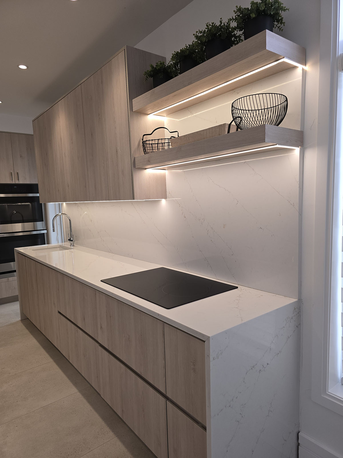 Upper cabinets provide hidden storage, while the open floating shelves with LED lighting offer a stylish display option. The kitchen also includes a flush cooktop for a minimalist, streamlined setup. Soft-neutral flooring rounds out the space for a cohesive, high-end feel.