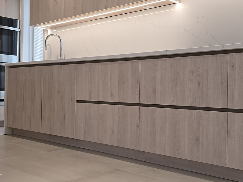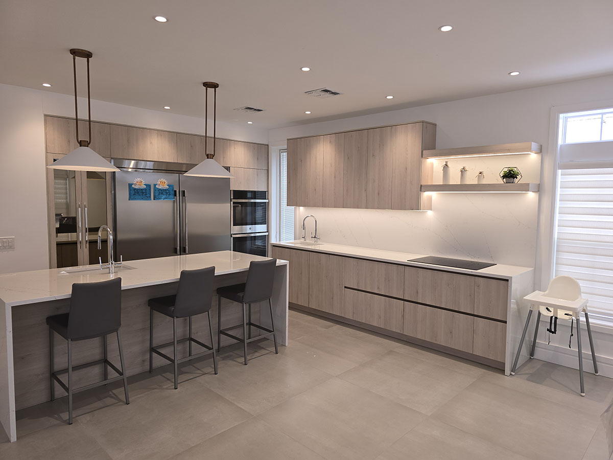 This kitchen showcases a sleek, full-access (frameless) design with light wood-grain cabinetry for a warm, contemporary look. The integrated panels create a clean, seamless appearance, paired with premium stainless-steel appliances including a built-in refrigerator and double wall ovens.