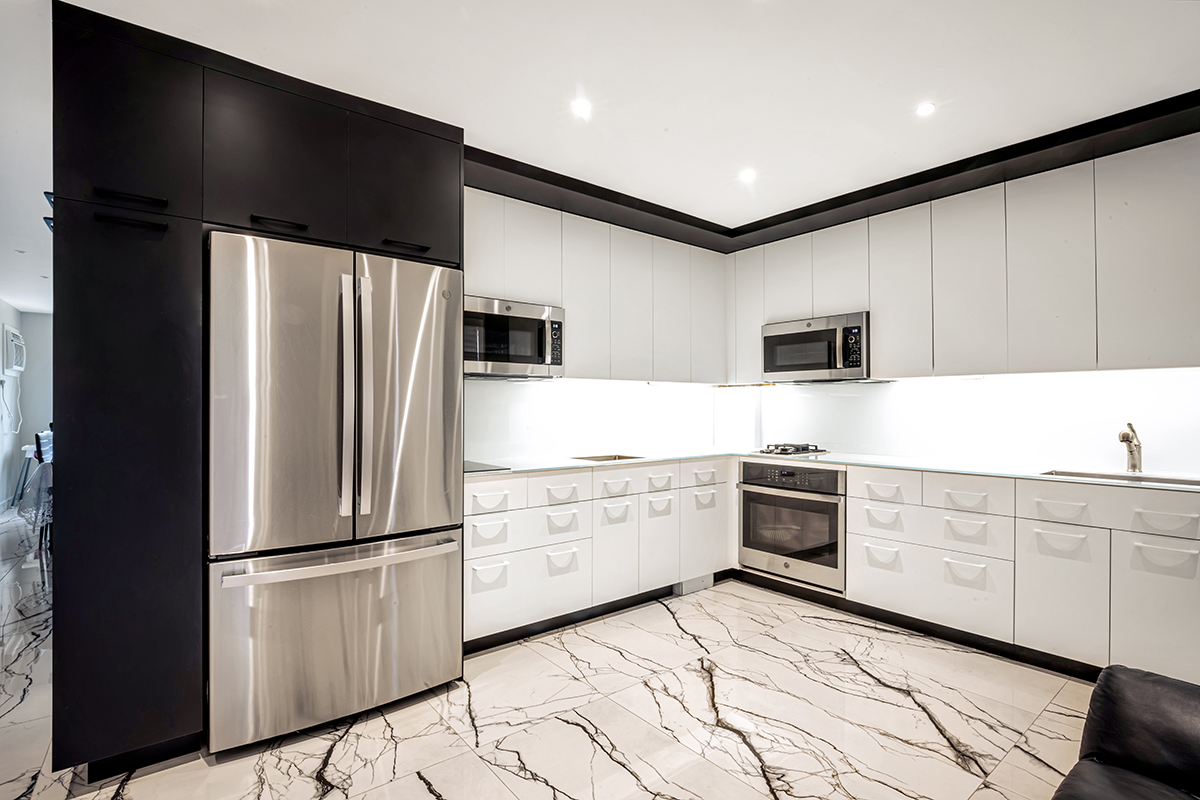 This modern kitchen is elevated by its sleek glass countertop, adding a crisp, luminous finish that enhances the room’s minimalist design. The transparent surface creates a light, airy feel while beautifully reflecting the under-cabinet LED lighting. Its smooth, seamless appearance brings a touch of elegance and modern sophistication, perfectly complementing the high-gloss cabinetry and stainless steel appliances. Durable, stylish, and easy to maintain, this countertop is the standout feature that pulls the whole space together.