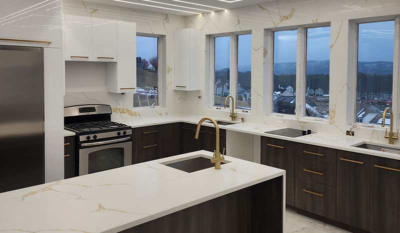 This stunning modern kitchen pairs sleek sophistication with warm, natural tones. The rich, dark wood base cabinets contrast beautifully with the crisp white uppers, while the waterfall-edge island creates a bold, seamless centerpiece. Gold hardware and matching faucets add a touch of luxury, complemented by the elegant marble-style counters and full-height backsplash. Expansive windows flood the space with natural light, highlighting the spacious layout. The unique LED ceiling design completes the look with a contemporary glow, giving the entire kitchen a stylish and upscale atmosphere.