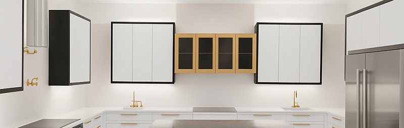 This elegant kitchen features a bold blend of modern luxury and refined design. The stunning centerpiece is a glossy black island wrapped in dramatic gold veining, paired with plush charcoal seating for a sophisticated touch. Crisp white cabinetry framed in black creates clean architectural lines, while the upper cabinets with gold borders add a striking focal point. Gold hardware and fixtures bring warmth and richness, beautifully complementing the polished flooring and premium stainless-steel refrigerator. Sleek, balanced, and upscale—this kitchen delivers a perfect harmony of contemporary style and high-end finishes.